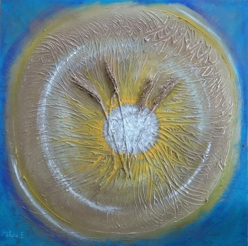 Acryl auf Leinwand mit Korn, Gold und Strukturen.