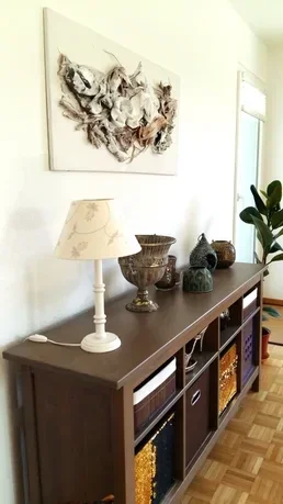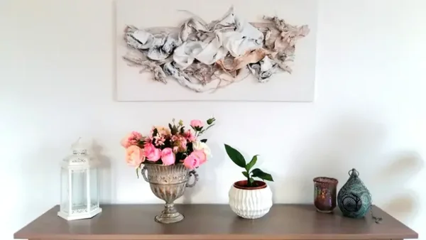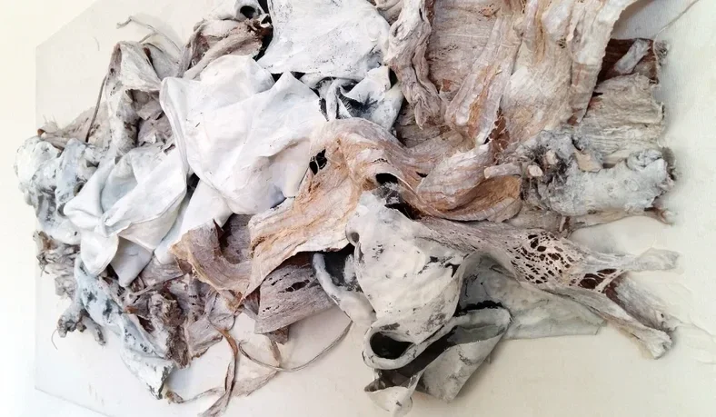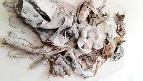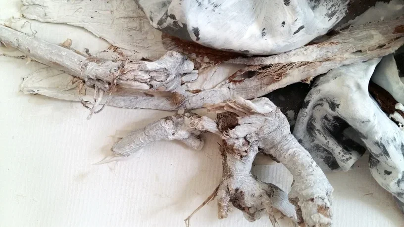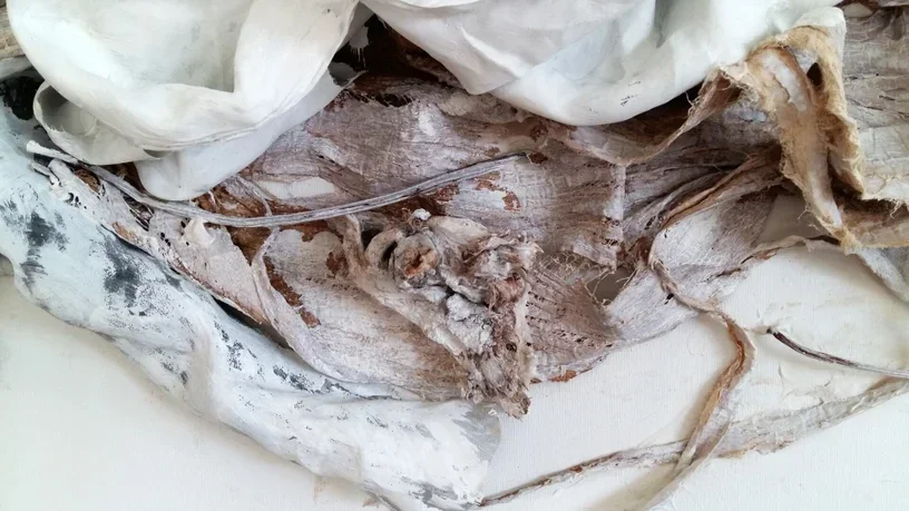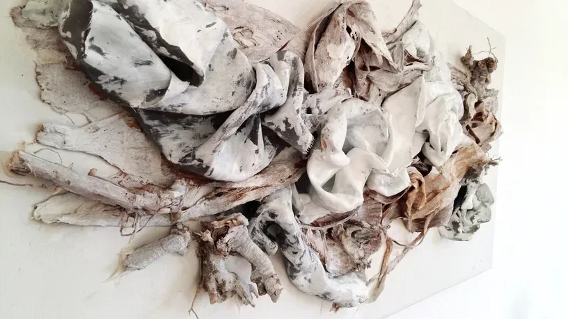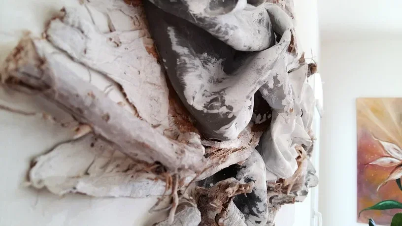 Acryl auf Leinwand mit Holz -Baumrinde, Textiltuch-Strukturen.